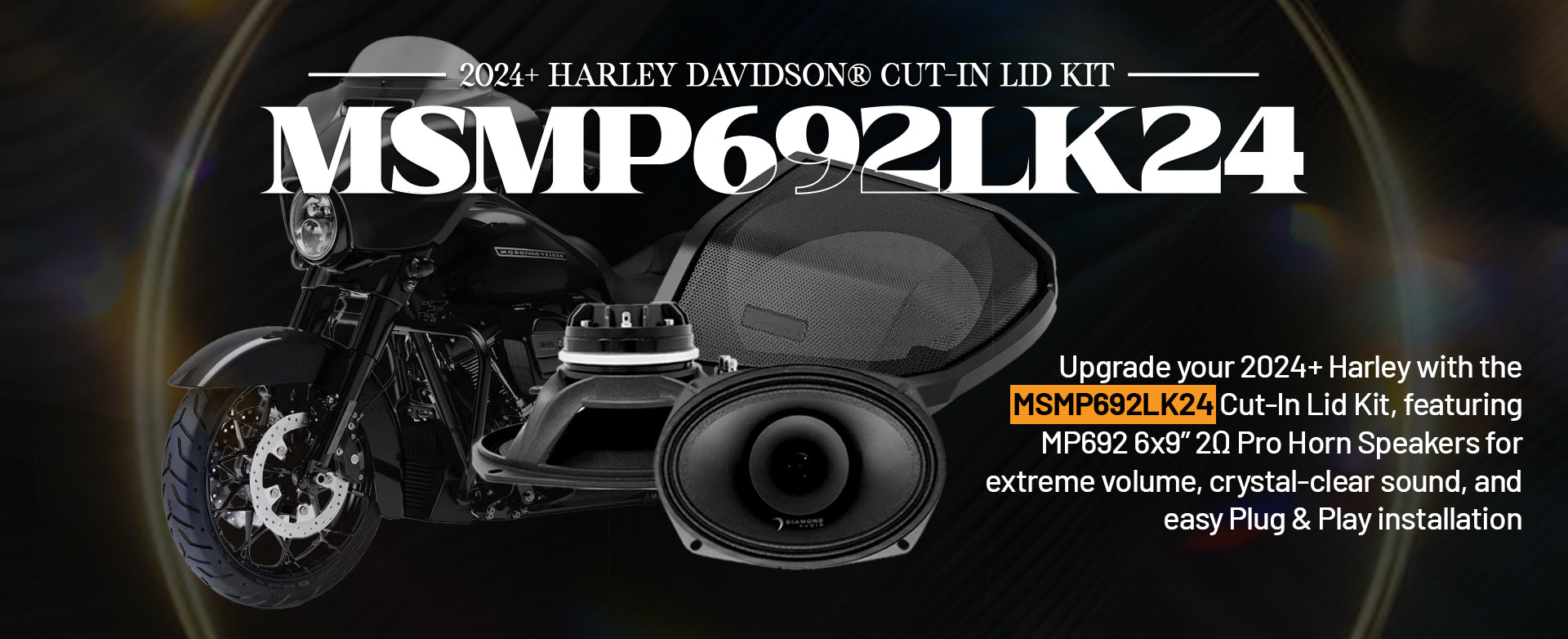 Power up your Harley Davidson® audio system with the MSMP692LK24 Cut-in Lid Kit, featuring MP692 6x9” 2-Way 2Ω Pro Horn Speakers for extreme sound clarity and volume.